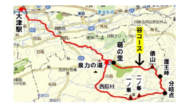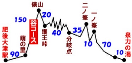 コースは肥後大津駅→萌の里→谷コース→俵山→護王峠→分岐点→二ノ峯→一ノ峯→泉力の湯