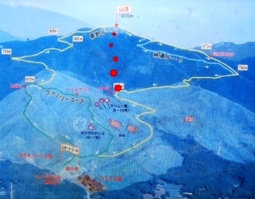 今回は俵山の尾根コースではなく、沢を登ってみました。赤●を進みます。