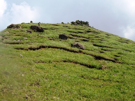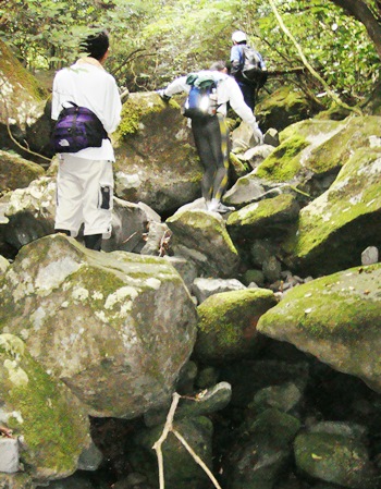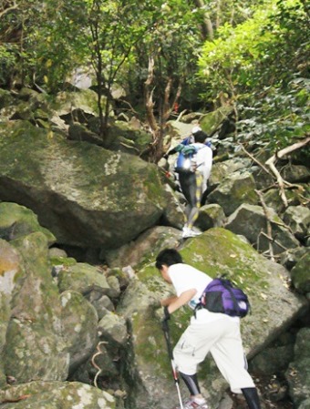 岩だらけ、それに傾斜もかなり急。まるでロッククライミング。これが1時間続きました。