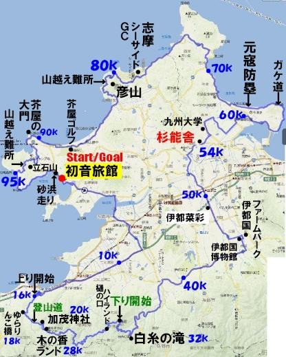 コース図:糸島半島からスタート。脊振山系の隣の山(二丈岳、地蔵)を走り、下山したら糸島半島を一周してゴール。