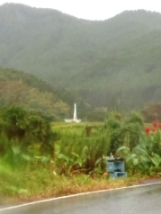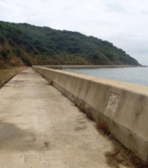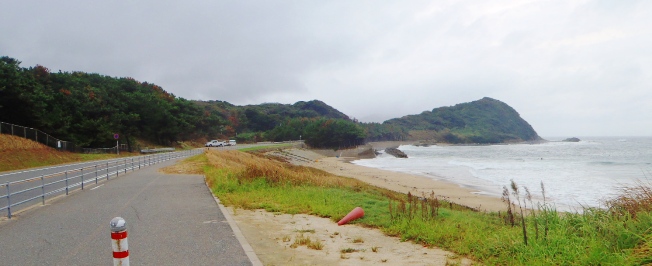 88kmで海岸沿いの狭い道へ。堤防を走りますが、強風で波しぶきが顔にかかります。