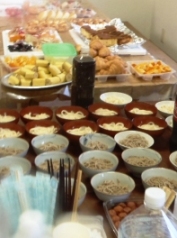 木の香ランド(二升瓶エイド)。そば・うどんといろいろな食材が用意。まるで食堂。朝食としておそばいただきました。