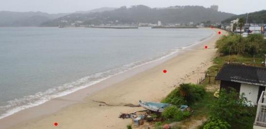最後の500mは「大会名物・海岸砂浜走り」波しぶきを受けながら砂地を走ります。気持ちいい!海と砂の境目(赤丸)が走りやすいです。