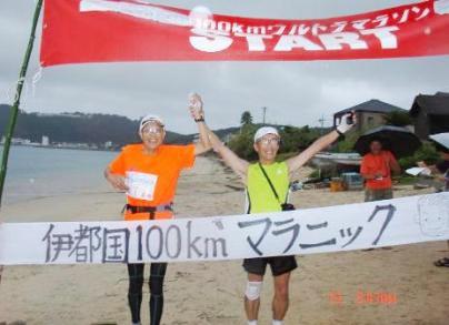 松原さんと一緒に両手を上げてゴール。12時間47分(午後5時47分)7位。立派!