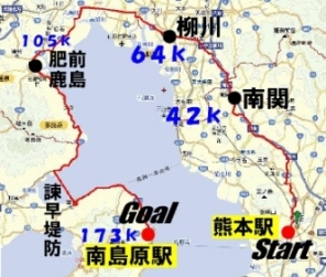 熊本駅スタート、南関、柳川、鹿島を通って、カキ焼き街道を下り、諫早堤防を渡って島原まで。