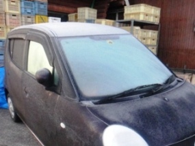 午前7時、肥前鹿島にて夜が明けてきました。車のフロントガラスは凍結。氷点下2度の冷え込み。