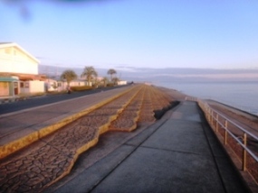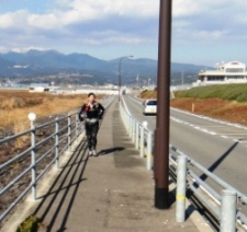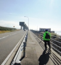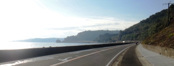 車道側が諫早、堤防側が有明海。堤防の上に道があるのですが進入禁止(T上さんはここを走ったとか)。