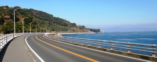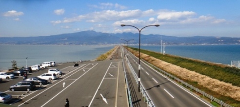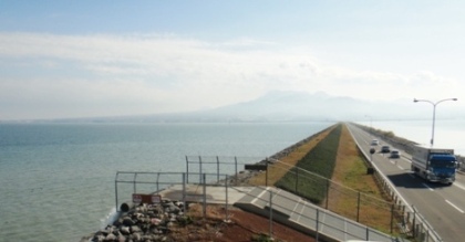 堤防は「雲仙多良シーライン」と呼ばれており、全長7km。対岸に見えるのは雲仙の山々です。