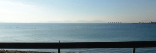 長崎県に入ったころより、水平線に諫早堤防が見えます。その長いこと!対岸は見えません。