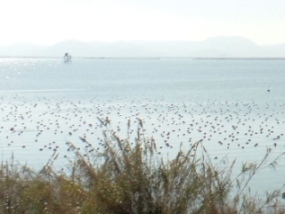 海には無数のカモ。中間地点にある展望所。トイレと案内板だけあります。自販機、売店はありません。