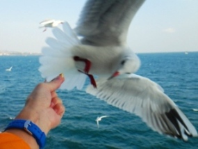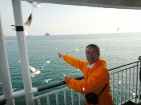 翌日九商フェリーで帰りましたが、多数のかもめが船を囲んでいます。