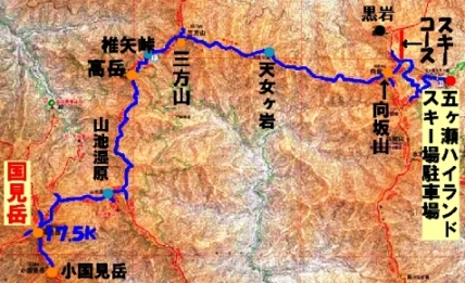 コース:スタートは五ヶ瀬ハイランドスキー場駐車場。向坂山→三方山→高岳→国見岳の往復。