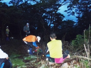 夜明け頃に三方山の手前で休憩(2時間40分経過)。