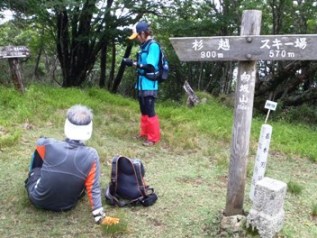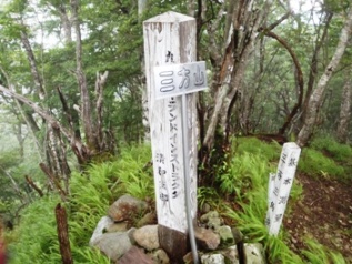 向坂山から三方山までは「脊梁トレラン大会」のコースです。所々に昨年の矢印・距離表示がそのままになっていました。
