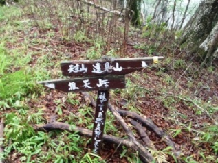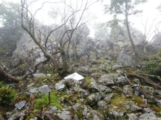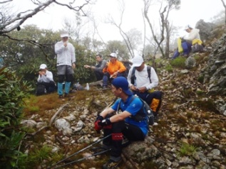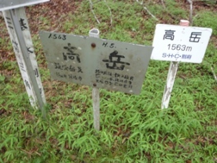 写真右:ガケを登って、道なき道をひたすらに登りやっと高岳(1563m)登頂・7時15分(登山道は別にありました)。