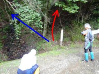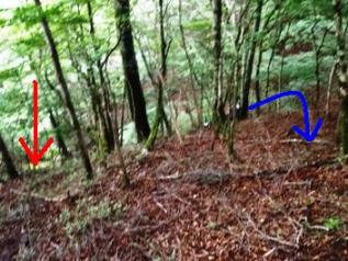 写真左:赤線の下から登り、青線に出てきます。ものすごいガケでした(ここは登山道ではありません)