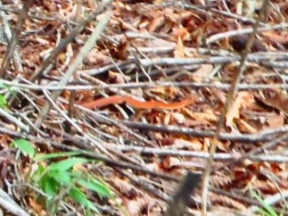 赤い20cmぐらいの蛇発見。ジムグリの幼ヘビだそうです。