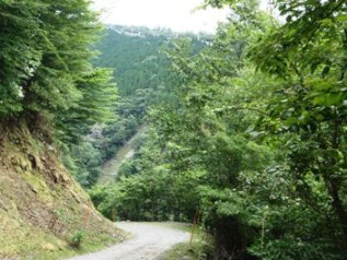 「椎矢峠」、登山道と林道が交差する地点。ここもガケ崩れで修理中。この辺でやっと片道の半分です。