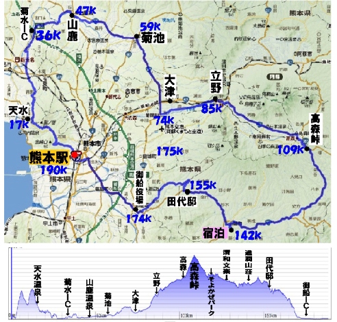 →菊池(4:30)→大津ヒライ(6:50)→立野(9:20)→高森(12:30)→そよかぜパーク(15:20)