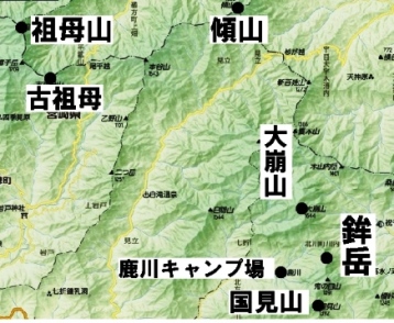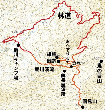 コース:鹿川(ししがわ)キャンプ場スタート→沢の横→国見山→別の沢→鉾岳(おんぽこ)→林道→キャンプ場。22km、累積高度1300m。