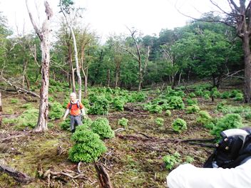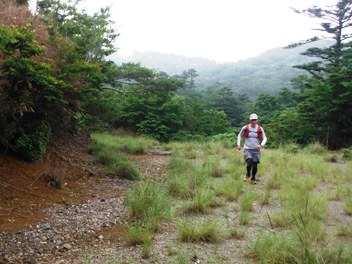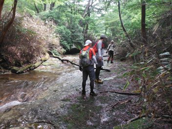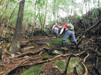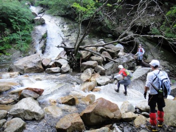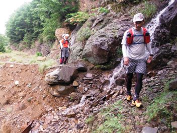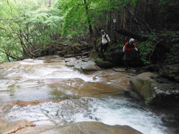 途中、数回沢を横断。水の量が多く、石はコケで滑るし、渡るのは至難のワザ。