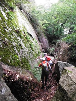 沢に下りて、沢の少し先から雌鉾に上るのですが、岩のコケで滑って、なかなか前に進めない。