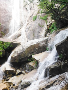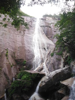 鉾岳の真下に来ると、そこに巨大な滝が出現!落差100mはある。滝の源流にあとで行きます。