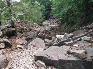 沢の水量が多いため、沢は行かず横の登山道を行きますが、ここも岩だらけで往生します。