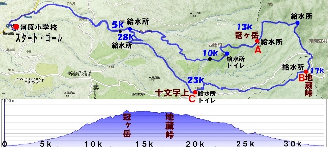 コース概要:河原小校門スタート→26号線横の村道→5kで分岐→13k冠ヶ岳→尾根道→グリーンロード→地蔵峠
