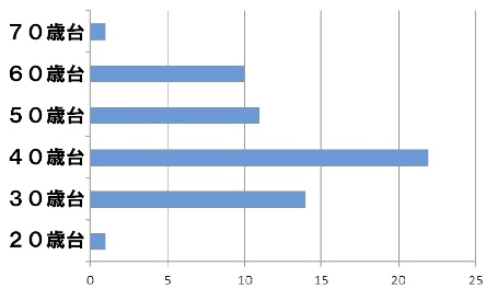 参加者の年齢構成は40歳台が一番多く平均は50歳弱。最高年齢70歳、最若は23歳。