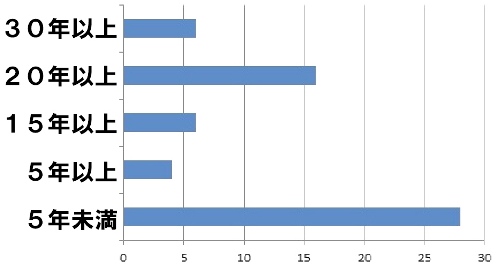総歴は5年未満が半数近い。ブームの波でしょうか。しかし、15年以上の人も28名います。