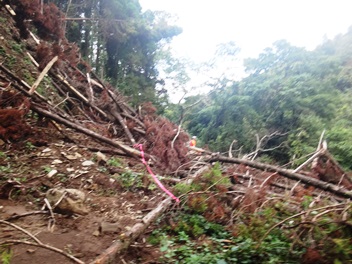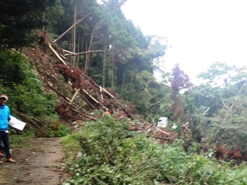 28kで崖崩れ。多くの木で道がふさがれていました。こんなひどい所を渡るのは初めて。