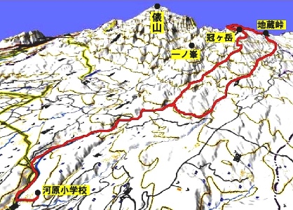 コースの3D図(ちょっとコースが違いますが)。冠ヶ岳までは上りの連続、地蔵峠からは下りの連続。