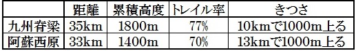 「九州脊梁山脈トレラン」との比較。コースは2km短い。累積高度は400mの差。トレイル率は同じ。