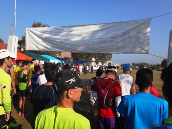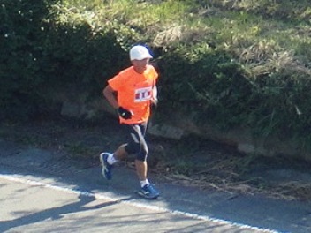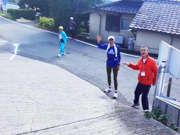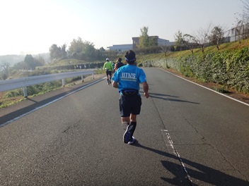午前9時、全員一緒に気勢を上げてスタート。スタート後1kmは下り。みなさん飛ばします。ついていけない。