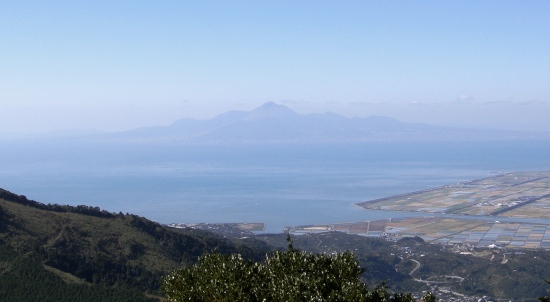 山頂からの景色は最高です。今日はガスでよく見えません。天気がよければ写真のように普賢岳(長崎雲仙)も見えます。