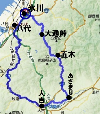 コース概要:熊本駅前→3号線南下→氷川町休憩、ここから山へ →東陽村(立神峡)→大通峠→道の駅「子守唄の里五木」