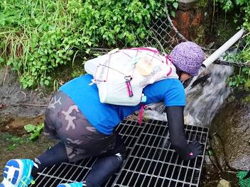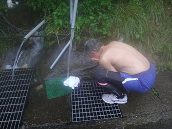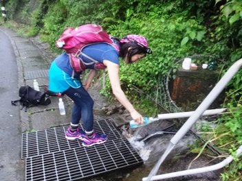 トンネルから3km先の湧き水。ここで飲み水補給、全身冷却。