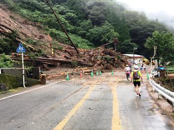 白滝公園手前(53km)の土砂崩れ現場。通行禁止となっていましたが、今は人は通れるということでした。