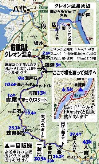 コース=@ゆっくり組:吉尾駅から15km、Aふつう組:一勝地駅から30km、Bぶっ飛ばし組:渡駅から36km。