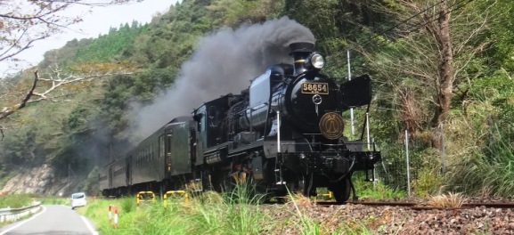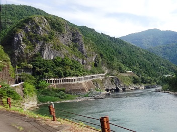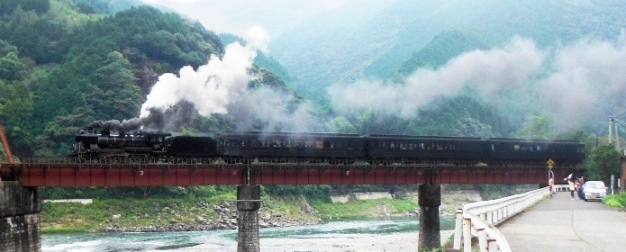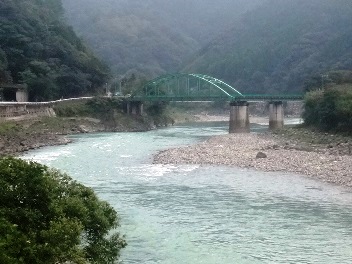鎌瀬駅の手前の球磨川第一橋梁橋を11時ごろSLが通過します。SLは橋の上で止まってくれます。