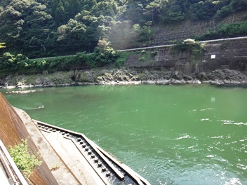 目の前、対岸に球泉洞。船の球磨川下りの終点はここです。