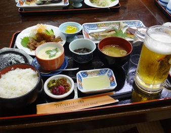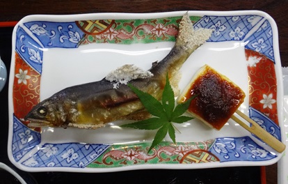 球磨川で獲れたアユの料理。最高でした。ビールも4杯いきました。