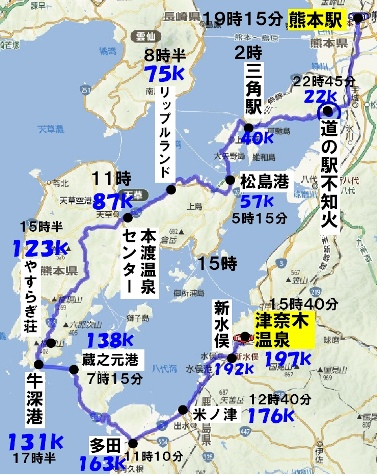 ステージ1=熊本駅(19時15分)→三角駅(2時)→上天草さんぱーる(4時)→リップルランド(8時30分)