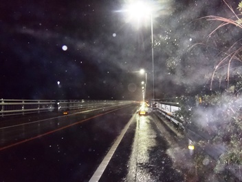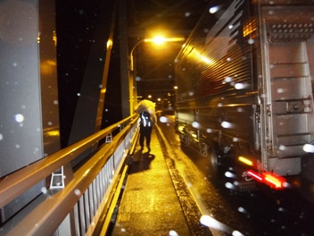 トラックが来たら、欄干にしがみついてました。暴風警報が発令されました。