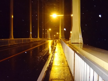 ところが、橋の中央ではその倍の風。吹き飛ばされそうな勢い。もう、服はビチョビチョ!!