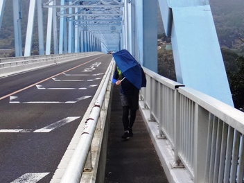 黒之瀬戸大橋を渡ります。木村さんは雨も降ってないのに、何故か傘で目隠し?