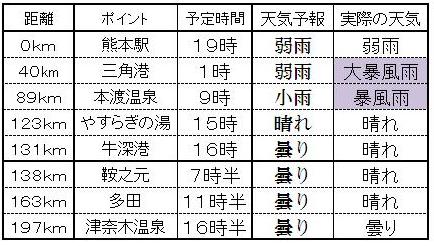 スタート前の天気予報と実際の天気です。天草五橋の間は台風なみの暴風雨でした。警報が出たくらいです。