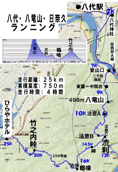 竹之内峠→日奈久→池田酒店→ひらやホテル。25km。累積高度750m 。