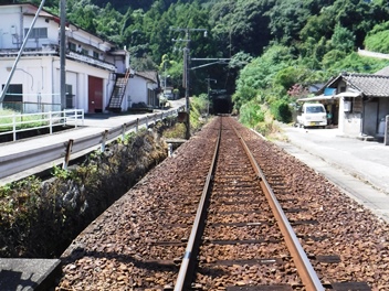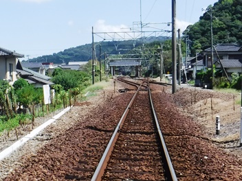 平地に下りて、踏切(肥薩おれんじ鉄道)渡ります。右手が日奈久駅です。